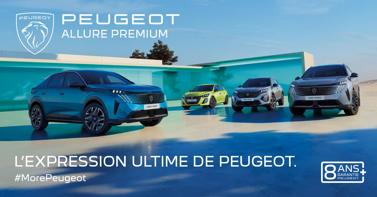 Jusqu’au 31 décembre 2025, profitez de l’offre Allure Premium : 8 ans ou 100’000 km de garantie (selon le premier seuil atteint) sur une sélection de véhicules Peugeot neufs achetés chez Moncor Automobiles.